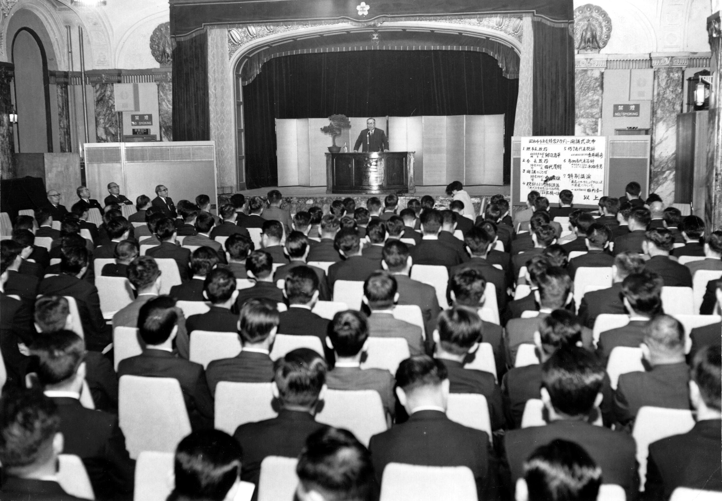 「経営アカデミー」は65年4月、わが国では初の経営教育の〝大学院〟として開設。体系的長期コースを備え、新時代の企業を担うにふさわしい経営者、管理者、専門家の資質向上と能力開発を進め、企業の経営水準を画期的に高めていくことが目的だ。